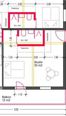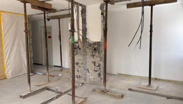 Nu, in april, volgt het slotakkoord: de verbouwing van de kamers 3 en 4, resp. 10 en 11 tot twee nog iets grotere studio’s van 30 m2 met een balkon op het zuiden en uitzicht over het Voorrijndal naar Obersaxen. Dat worden ook tweepersoonskamers met badkamer en een keukenblokje, maar ook met een “Schlafsofa” die uitgeschoven kan worden tot een comfortabel bed van 140x200, bijvoorbeeld voor kinderen. Deze nieuwe studio’s “Piz Mundaun” en “Piz Sèzner” - vernoemd naar bekende wandelbestemmingen - moeten in mei klaar zijn. Direct na het vertrek van de laatste bus terug naar Nederland is met de sloop begonnen, zie de foto hieronder.