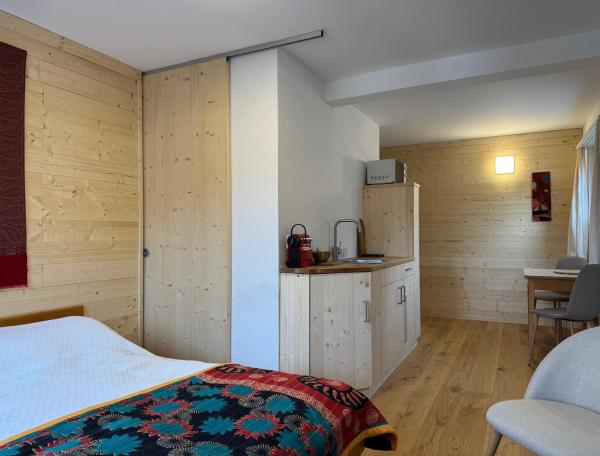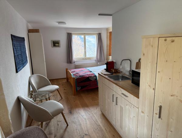 De vier nieuwe studio’s zijn beschikbaar als gewone, zij het bijzondere, hotelkamers met volpension, net als alle andere 27 hotelkamers (19 in het hotel, plus 8 in het Kleine Huis). Maar je kunt ze ook als zelfstandig appartement boeken, dan is de prijs lager. De studio’s “Cauma See” en “Cresta See” worden ook met een prijs voor één persoon aangeboden, de andere twee, grotere studio’s aan de zuidkant niet. Zie de website voor prijzen van de verschillende alternatieven. Goed te weten is dat waar hotelkamers in principe alleen geboekt kunnen worden voor ongeveer de periode tussen de dagen waarop de bus tussen Arnhem en Waltensburg rijdt, boekingen voor één van de zelfstandige appartementen ook voor kortere periodes mogelijk zijn, althans buiten het hoogseizoen. Die appartementen, met inbegrip van de studio’s als ze zónder volpension geboekt worden, zorgen zo voor flexibiliteit.
