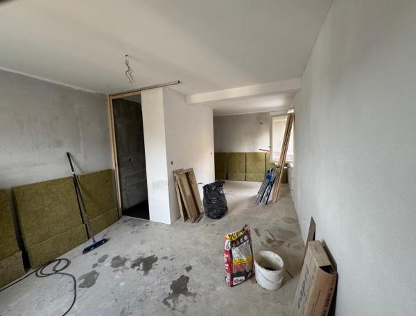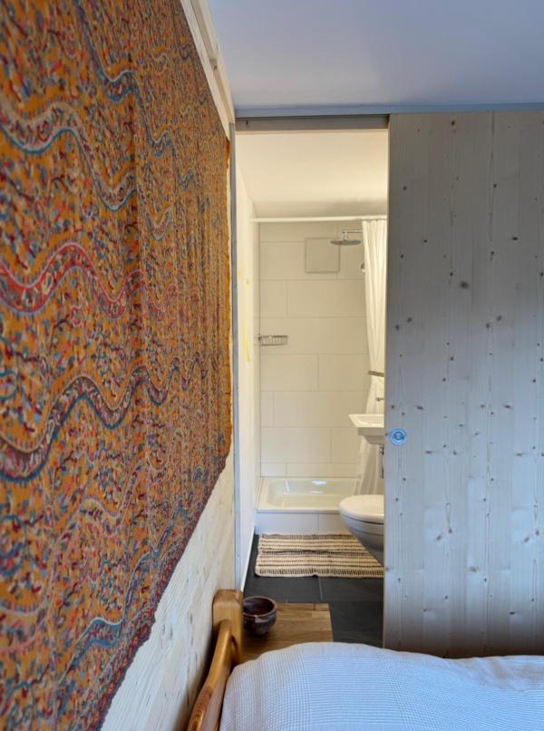 Eind vorig jaar hebben we vervolgens op beide verdiepingen van de oostvleugel van de twee laatste kamers (5 en 6, resp. 12 en 14) aan de noord-oostzijde studio’s gemaakt, goed geïsoleerde tweepersoonskamers met eigen badkamer en een eenvoudige keuken, opdat je, bijvoorbeeld vanwege een speciaal dieet, ook voor jezelf kunt zorgen. Zie de foto’s hieronder van het eindresultaat, dat gelukkig al een paar gasten goed is bevallen.